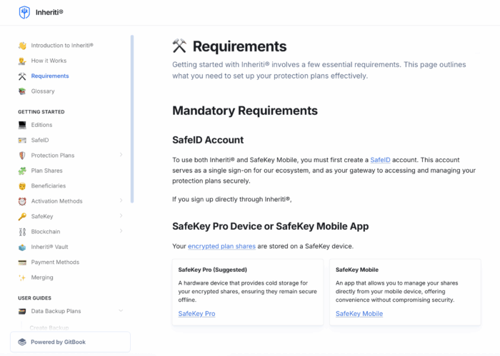 For all additional details, we encourage everyone to explore the Inheriti® Documentation Portal. It’s a clear and well-organized guide that explains everything about how Inheriti® works. The documentation starts with the basics—what Inheriti® is and how it helps you protect your digital life with encrypted, decentralized, and secured backup plans. It then walks you through the process of creating a protection plan, how your data is encrypted and split into secure pieces, and how those pieces can be safely brought back together when needed.