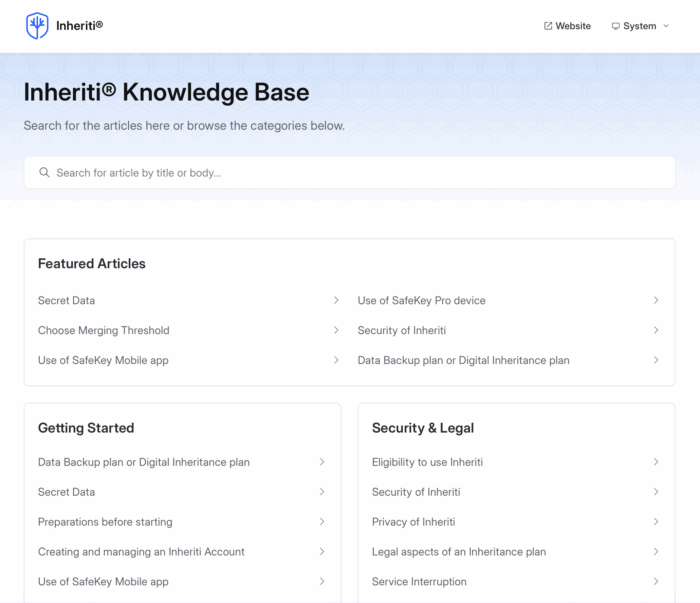 We warmly invite all Inheriti® users, as well as anyone interested in securing their digital legacy, to explore the Inheriti® Knowledge Base. This structured library of information provides clear insights into digital inheritance, security principles, Secret Data, Merge Authority selection, and the patented Secure Share Distribution Protocol (SSDP). Organized into sections such as Getting Started, Creating a Protection Plan, The Role of the Shareholder, and Merging Process, it serves as a reliable reference for understanding how Inheriti® works and why it is the most secure solution for protecting digital assets. Continuously updated with security-focused knowledge, the Knowledge Base is the authoritative source for everything related to Inheriti®.